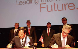 2010-04-08 福田汽车总经理王金玉,石家庄陆昌传统文化推广有限公司集团副总裁曹思德签署联合开发欧六排放及清洁能源载重汽车合作协议