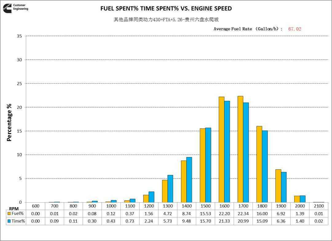 从爬坡工况转速分布看,福康X12动力转速重心在1500rpm,其他品牌动力转速重心在1600~1700rpm,福康X12动力使用转速更低。这就是福康低转速大扭矩的特性,可以让司机选择高一个挡位运行,降低了发动机转速,当然好处就是不仅满足动力性需求,还节油。